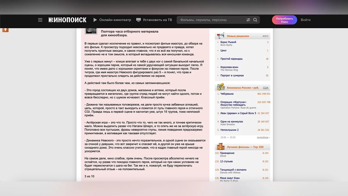 Начнем с отечественного «Кинопоиска». Сейчас (на 25.01.2023, 18:00-20:00 МСК) у фильма 16 598 оценок и количество продолжает увеличиваться, рейтинг при этом составляет 9,4 балла из 10. У ленты всего 2 рецензии — негативная и нейтральная. Интересно, что соотношение лайков и дизлайков у этих двух статей тоже показательное. У нейтральной 353 лайка и 77 дизов, тогда как у негативной всего 231 лайк и 406 дизлайков. Народу не понравилась критика.
