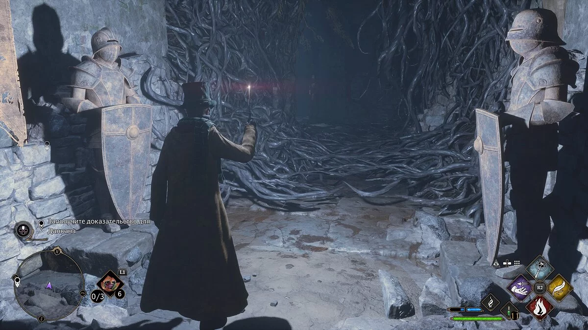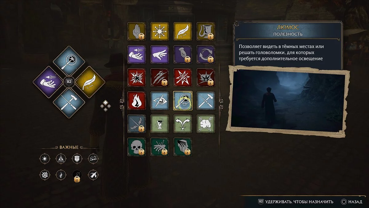 Главное достоинство Hogwarts Legacy — боевая система. Заклинаний действительно много: все они легко комбинируются в бою, либо нужны для исследований. Магия поделена на группы, которые различаются цветами. Желтая отвечает за перемещение объектов и контроль — например, заморозка или подбрасывание в воздух. Фиолетовая — это мощь, благодаря которой можно использовать физические свойства, притягивать и отталкивать, жонглировать, бить о землю. Красная — максимальный урон. В этой группе собрано то, чем вы чаще всего сражаетесь. Синяя — общие полезные скиллы, например, невидимость или свет. Наконец, зелёная — трансфигурация, необходимая для Выручай-комнаты. Заклинания позволят создавать предметы из воздуха, менять их цвета и размеры.