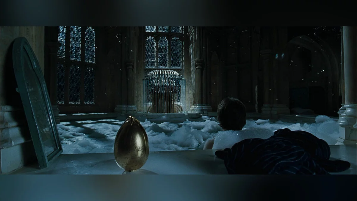Трудно определить, какая форма у ванной старост в киновселенной Гарри Поттера. Но версия из игры определенно отличается от неё. Это прямоугольное помещение с одним выходом, в центре которого стоит бассейн такой же формы.