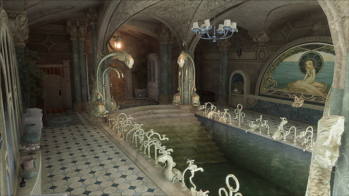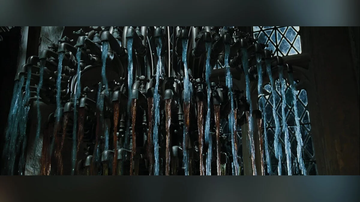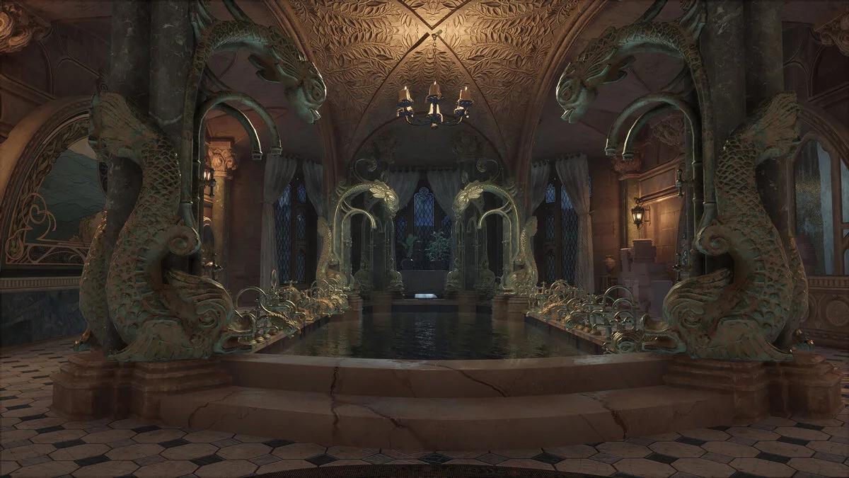 Многие запомнили монструозную конструкцию из кранов, которая выглядит будто перевернутая люстра. В Hogwarts Legacy выдумке волшебников тоже нашлось место, только теперь разнообразные краны расположены вдоль широких сторон купальни. Русалка с витража переехала на большую картину, а сама комната в целом имеет более презентабельный вид.