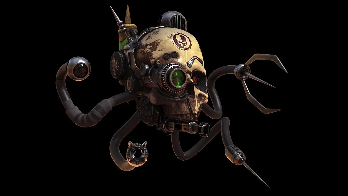 Конечно, авторы вселенной Warhammer 40,000 не могли просто взять и создать скучных дронов-помощников. Вместо них они придумали сервочерепа. Сервочереп — это в буквальном смысле человеческий череп, в который запихнули различную электронику, инструменты и антиграв, позволяющий ему летать.
