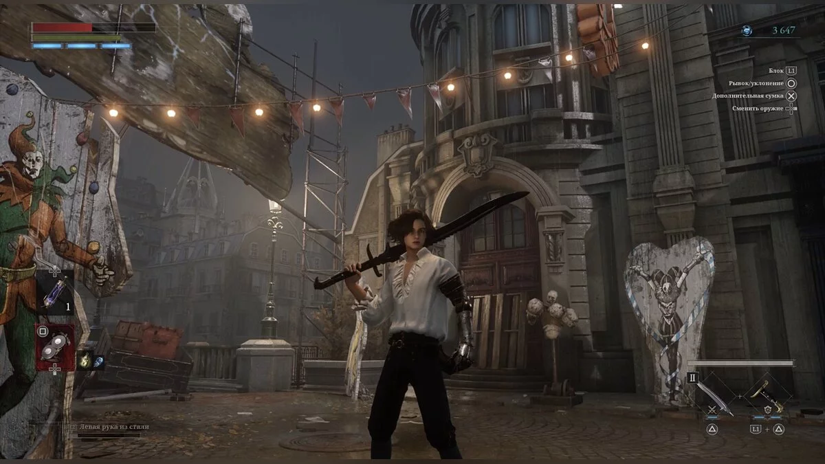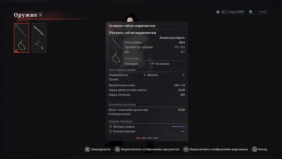 И да, вы уже знаете, что это такое. Подобная система была в Elden Ring и всё в той же Steelrising. Любое оружие состоит из двух частей — рукояти и клинка. Каждый составной элемент имеет собственную способность, на которую тратится определенное количество ячеек «маны». Как правило, лезвие даёт атакующий скилл, а рукоять — временное пассивное усиление.