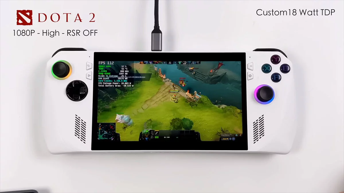 Время автономной работы в режиме потребления 30 Вт — 57 минут. В производительном профиле 15 Вт — 1,5 часа. В режиме «просмотра видео» консоли хватило на 5 часов. И устройство от ASUS, и Steam Deck показывают примерно одинаковое время автономной работы при одинаковом профиле энергопотребления. Заряжается от 0 до 100% устройство за 70 минут, вдвое быстрее по сравнению со Steam Deck.