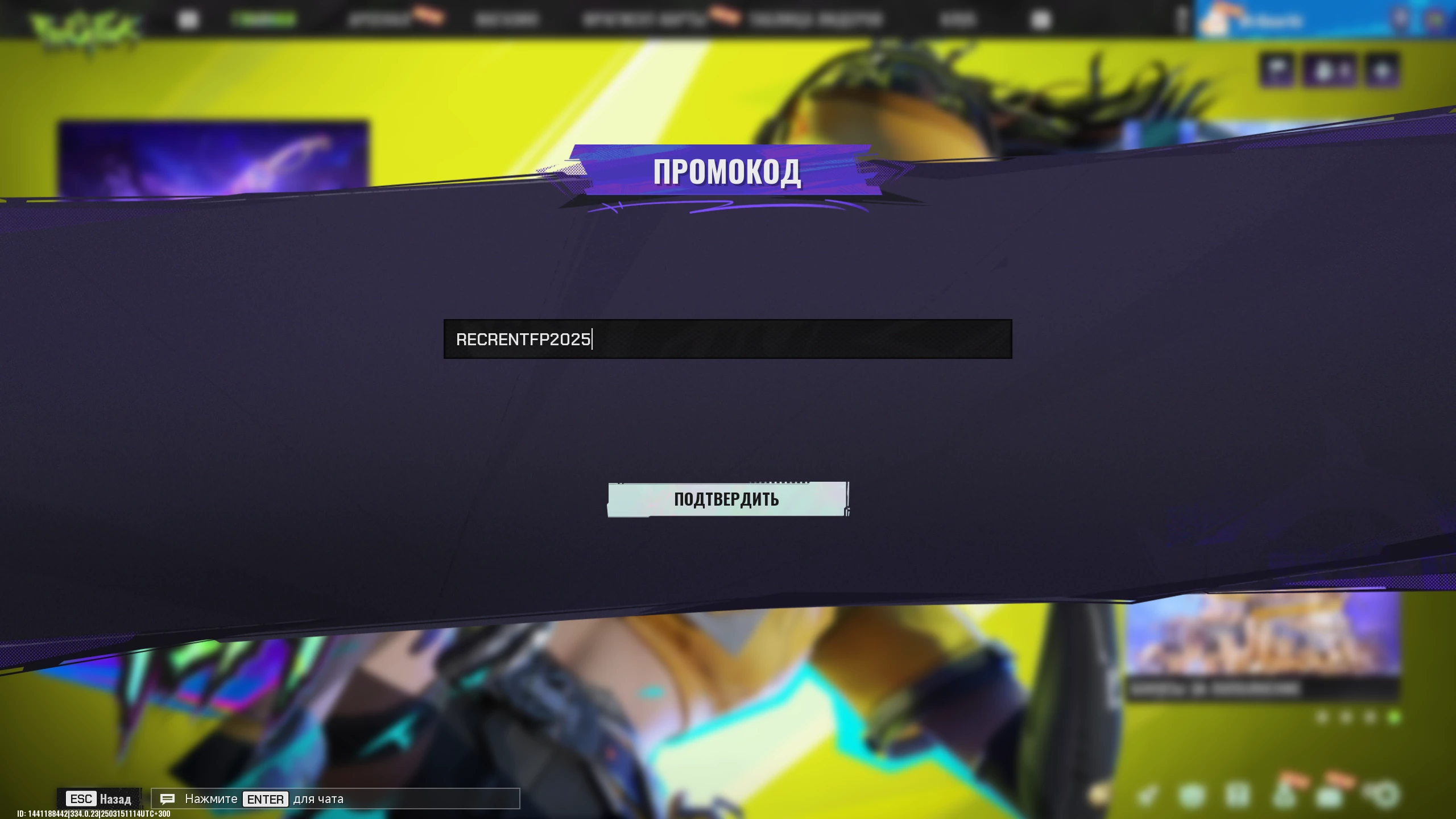 У головному меню натисніть на кнопку опцій (Esc), потім виберіть «Промокод» і в з'явлене поле введіть код. Після цього отримайте свої нагороди.