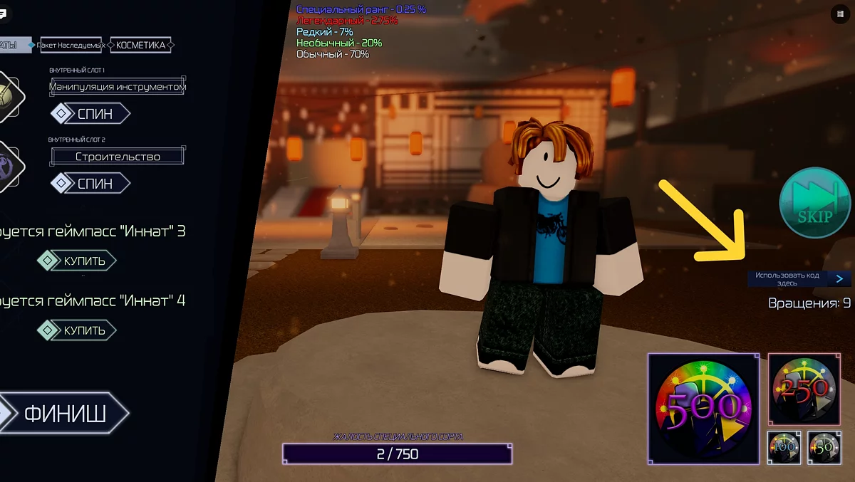- Спіни — валюта для отримання рідкісних технік через систему гача. Чим їх більше, тим вищий шанс виграти потужні здібності, такі як Безкінечність або Шестиглазий.