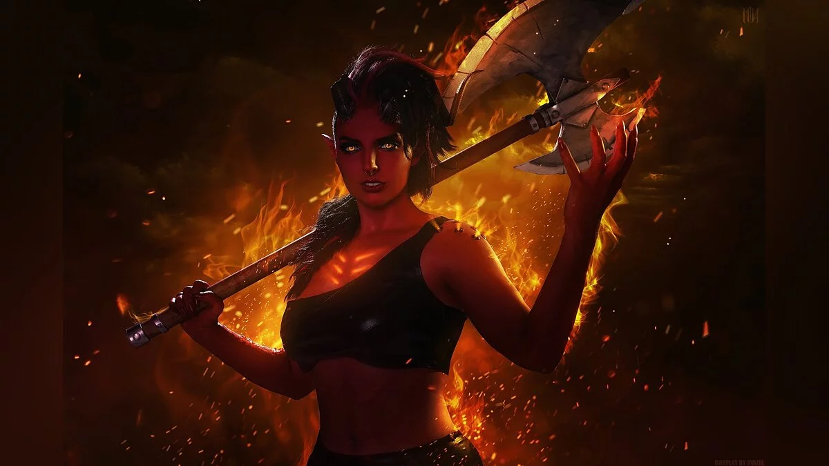 Также мы хотим выделить девушку-тифлинга по имени Карлах. Красная кожа и страстный темперамент делают красотку невероятно экзотичной. Её образ воплотила в жизнь Настя Волкова, также известная как Svizee. Фотограф — MIVA.