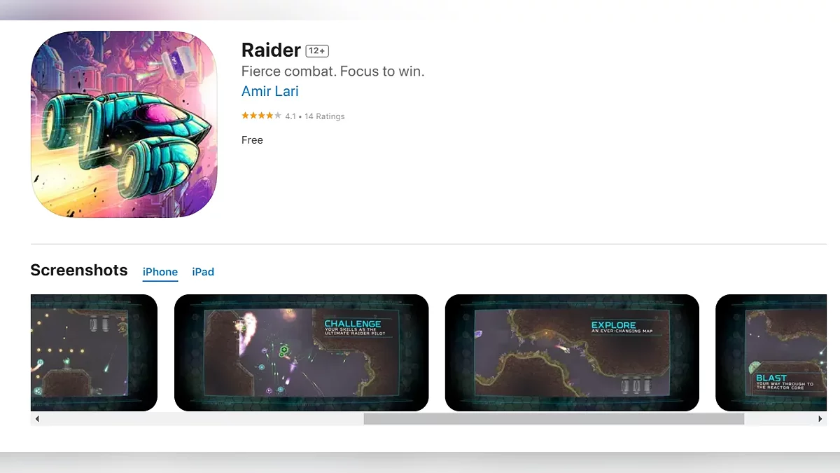 - Raider — аркадний екшен, в якому гравцеві потрібно боротися на зорельоті з різними ворогами (завантажити безкоштовно);