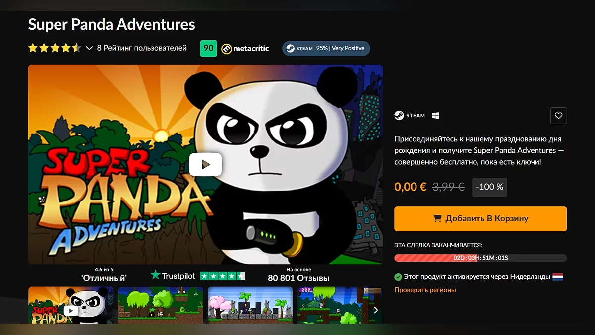 - Додати Super Panda Adventures в кошик і оформити замовлення. Після цього можна отримати ключ гри для активації в Steam.
