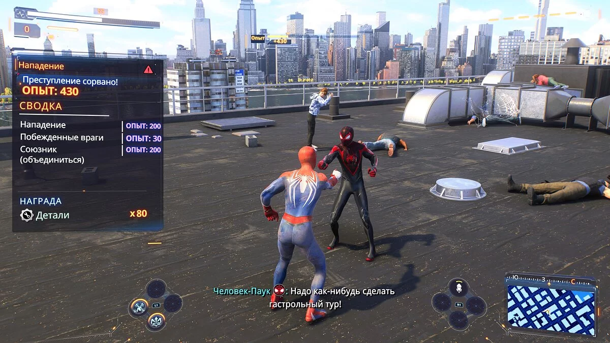 В Marvel's Spider-Man 2 задумка получает логичное развитие. Отныне у нас два играбельных персонажа, у каждого из которых есть как личные задания, так и общие квесты, в которых может поучаствовать любой из Пауков. В открытом мире протагонисты тоже регулярно пересекаются, что неплохо работает на погружение. Но на геймплей это всё особо не влияет. Единственное, чем отличаются Майлз и Питер — боевые навыки, но об этом позже.