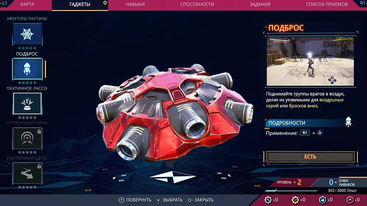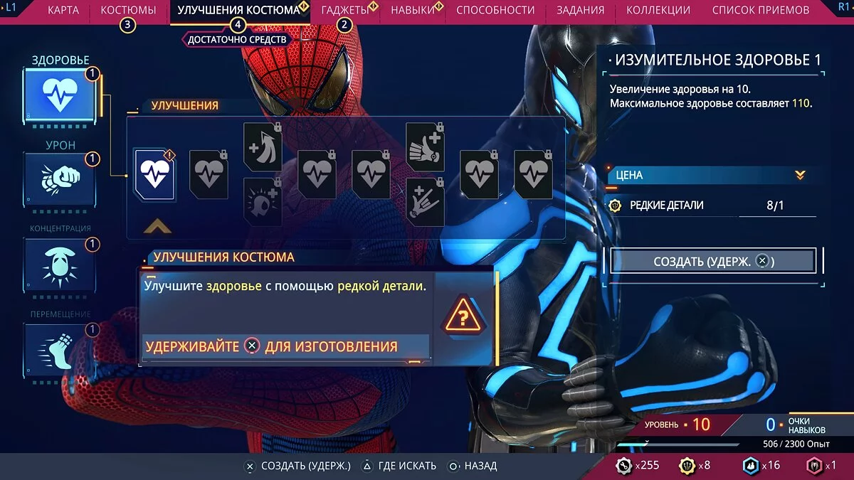 Количество гаджетов, как и способности восстанавливаются со временем или от ударов. Процесс можно ускорить развитием костюма. Отныне все наряды пауков меняют героев только косметически. Прокачка способностей и возможностей костюма никак от цветов и стилей не зависят.