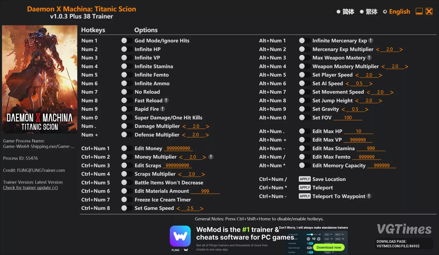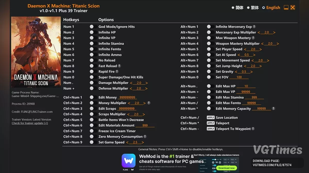 Функції та команди: Num 1 – God Mode/Ignore Hits — Режим бога/Ігнорувати урон. Num 2 – Infinite HP — Безмежне здоров'я. Num 3 – Infinite VP — Безмежні VP. Num 4 – Infinite Stamina — Безмежна витривалість. Num 5 – Infinite Femto — Безмежний ...