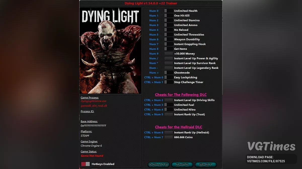 Функції та команди: Insert — Активувати трейнер. Num 0 — Безмежне здоров'я. Num 1 — Вбивство з одного удару. Num 2 — Безмежна витривалість. Num 3 — Безмежні патрони. Num 4 — Без перезарядки. Num 5 — Безмежні метальні предмети. Num 6 — ...