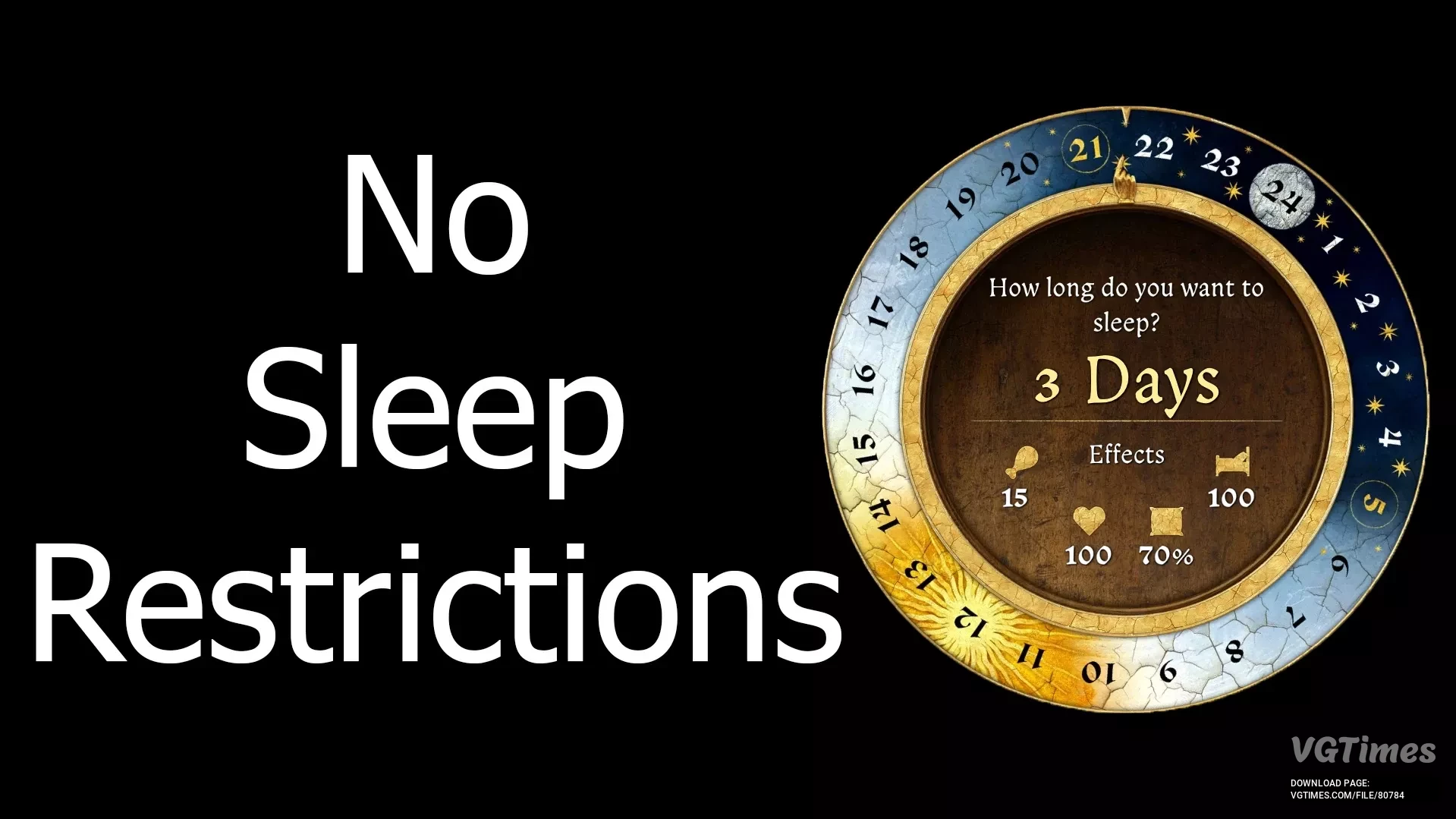 Завдяки цьому модулю зникають обмеження на сон і можливість переспати. Тепер ви можете спати скільки завгодно, якщо у вас достатньо їжі. Встановлення: Витягніть вміст архіву в папку за адресою: ...\Steam\steamapps\common\KingdomComeDeliverance ...