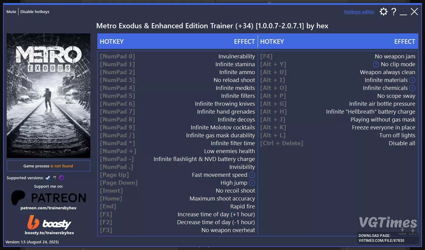 Трейнер від 15.03.2022 Fix — виправлена проблема з непрацездатністю на деяких ОС Функції: Num 1 — Необмежене здоров'я Num 2 — Необмежений таймер фільтра Num 3 — Необмежений таймер протигаза Num 4 — Необмежена кількість патронів Num 5 — Необмежена к ...