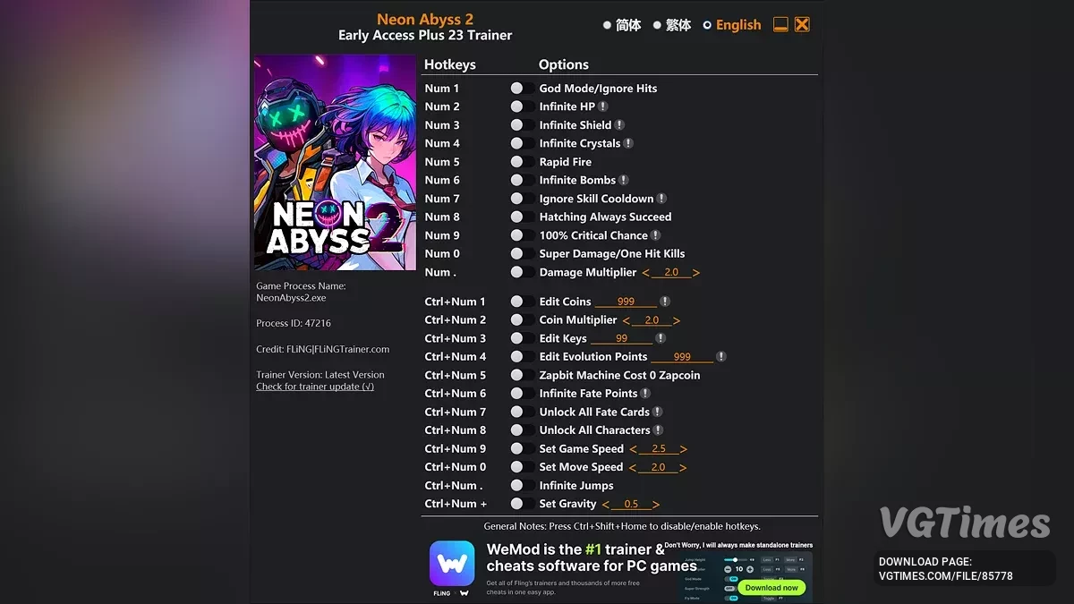 Завантажте найкращі та нові чіти і тренери для Neon Abyss 2. Відкрийте для себе топові файли, які допоможуть вам досягти нових висот у грі.