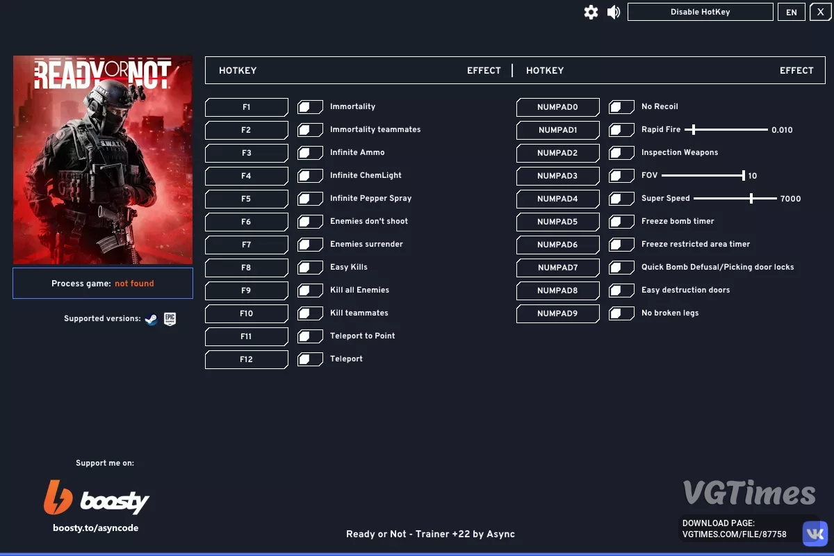 Функції та команди: Безкінечне здоров'я — безкінечне здоров'я. Модифікатор швидкості руху — швидкість руху. Без страху — відсутність страху. Без втоми — відсутність втоми. Редактор поля зору — редактор поля зору. Бронебійні кул ...