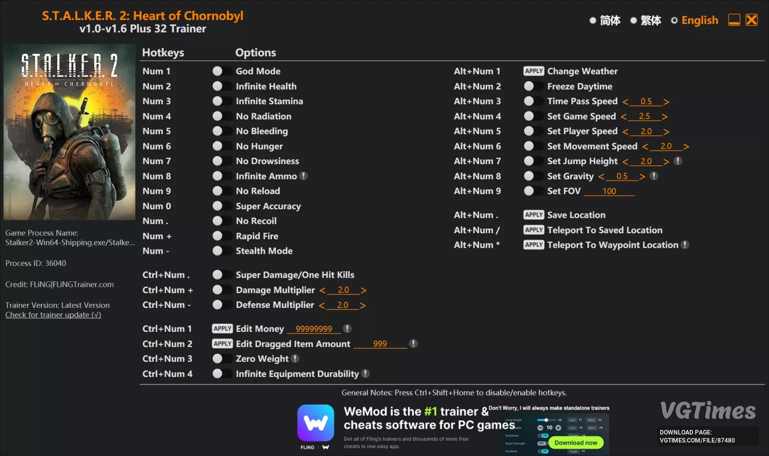 Завантажити Функції та команди: Numpad 1 – Невразливість; Numpad 2 – Необмежене здоров'я; Numpad 3 – Необмежена витривалість; Numpad 4 – Без радіації; Numpad 5 – Без кровотеч; Numpad 6 – Без голоду; Numpad 7 – Без сонливості; Numpa ...