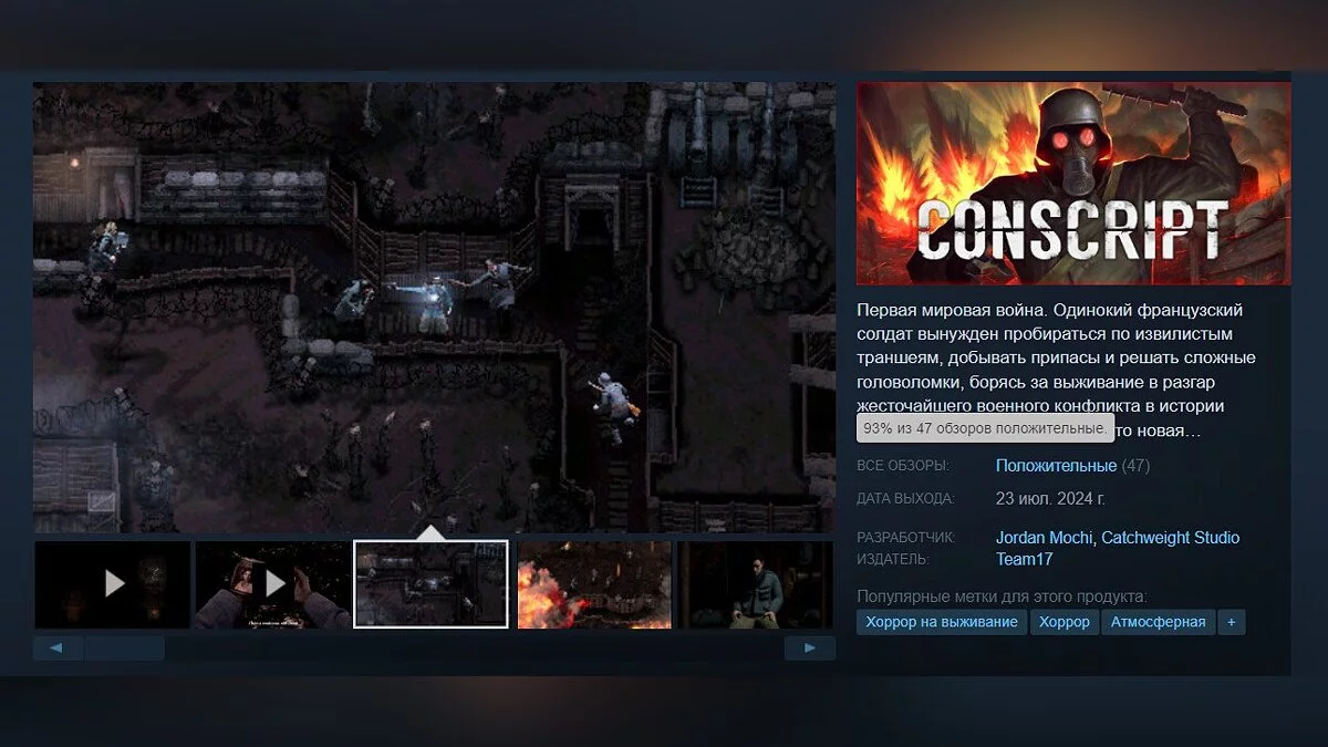 На PC и всех актуальных консолях вышел хоррор на выживание в сеттинге Первой мировой войны под названием CONSCRIPT. В Steam проект получил первые отзывы. Сейчас его рейтинг составляет 93%.