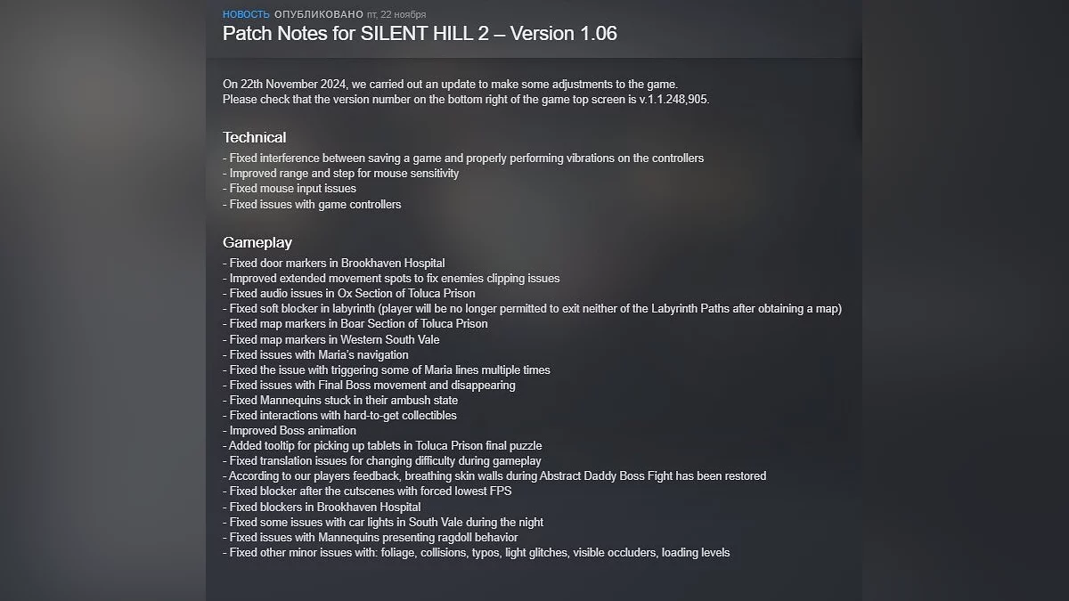 Окрім іншого, у ремейку Silent Hill 2 виправили чергову порцію багів, таких як навігація Марії, підрахунок трофеїв, експлойт у Лабіринті та зникнення фінального боса, а також усунули проблеми з графікою на PlayStation 5 Pro.