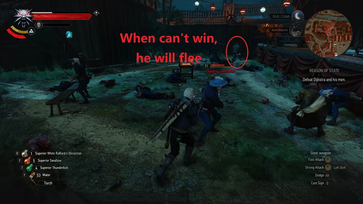У квесті «Справи державної важливості», якщо гравець обирає сторону Роше, Freak додає більше прихильників Дійкстри, щоб бій з політично важливою фігурою став дійсно складним. Крім того, за боєм тепер спостерігає Філіппа Ейльхарт в образі сови. Вбити Дійкстру в бою Геральт не зможе — шпигун достатньо розумний, тому він втече з бою при досягненні 10% здоров'я. При цьому Філіппа спробує його вбити.