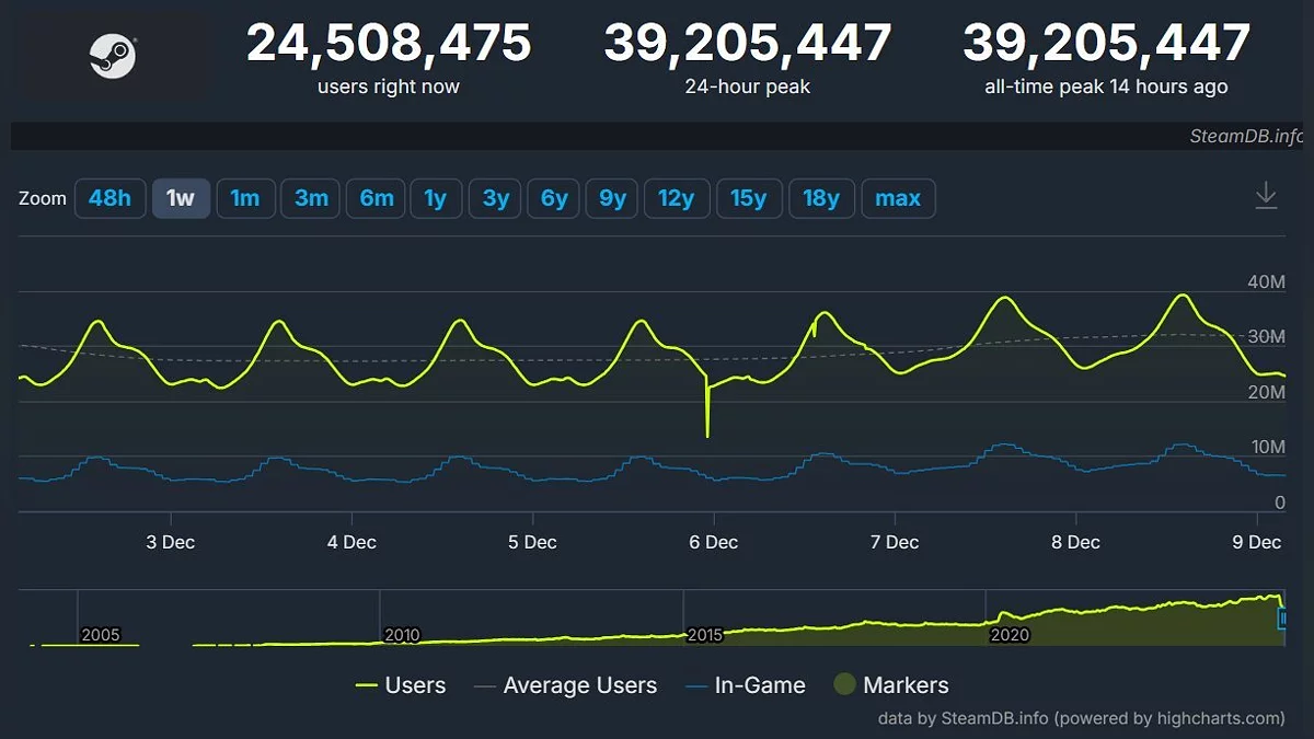 В Steam знову був встановлений новий рекорд за кількістю користувачів, які одночасно перебували в статусі онлайн. У сервісі було зафіксовано 39,2 млн геймерів. Це сталося 8 грудня.