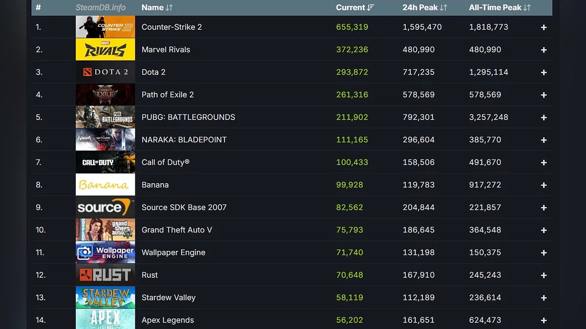 Що стосується найпопулярніших ігор, нещодавно в першу п'ятірку проєктів за онлайном вирвалися Marvel Rivals (пік онлайну — майже 481 тис) та Path of Exile 2 (пік онлайну — 578 тис гравців).