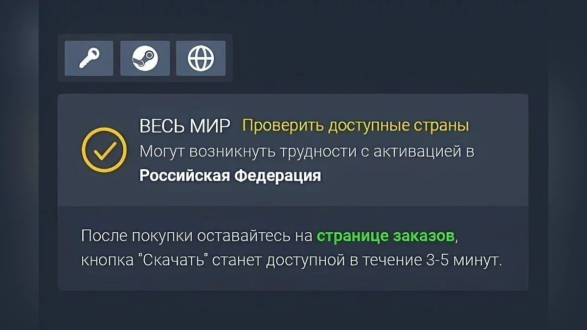 У зв'язку з санкціями багато видавців видалили свої ігри з російського Steam. У такому випадку з активацією ключа в цьому регіоні можуть виникнути проблеми. Відповідний напис буде в описі товару: