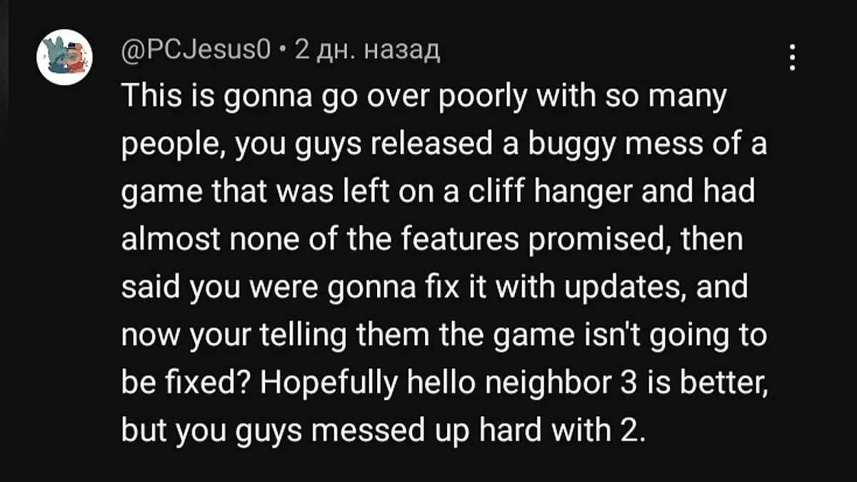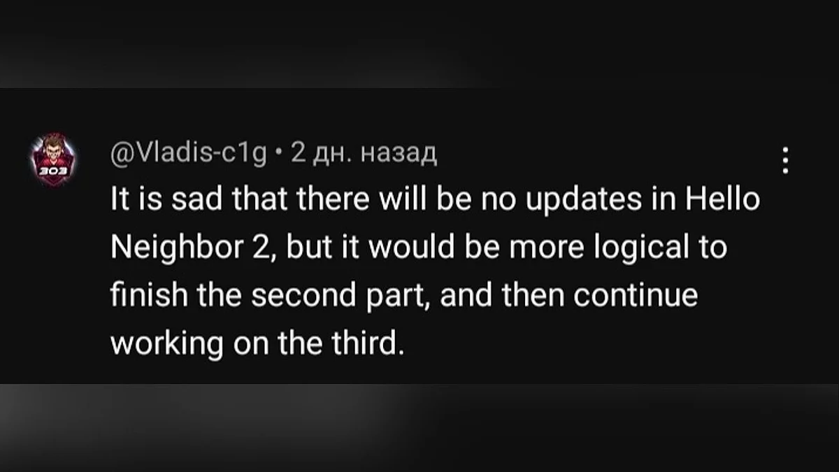 Микита Колесников є головним творцем/гейм-дизайнером франшизи Hello Neighbor, і в недавньому відео про створення Hello Neighbor 3 він сказав, що 1.0 патча для Hello Neighbor 2 фанати можуть не чекати. Це пов'язано з тим, що розробники з Eerie Guest Studio вкладають всі зусилля в розробку Hello Neighbor 3.