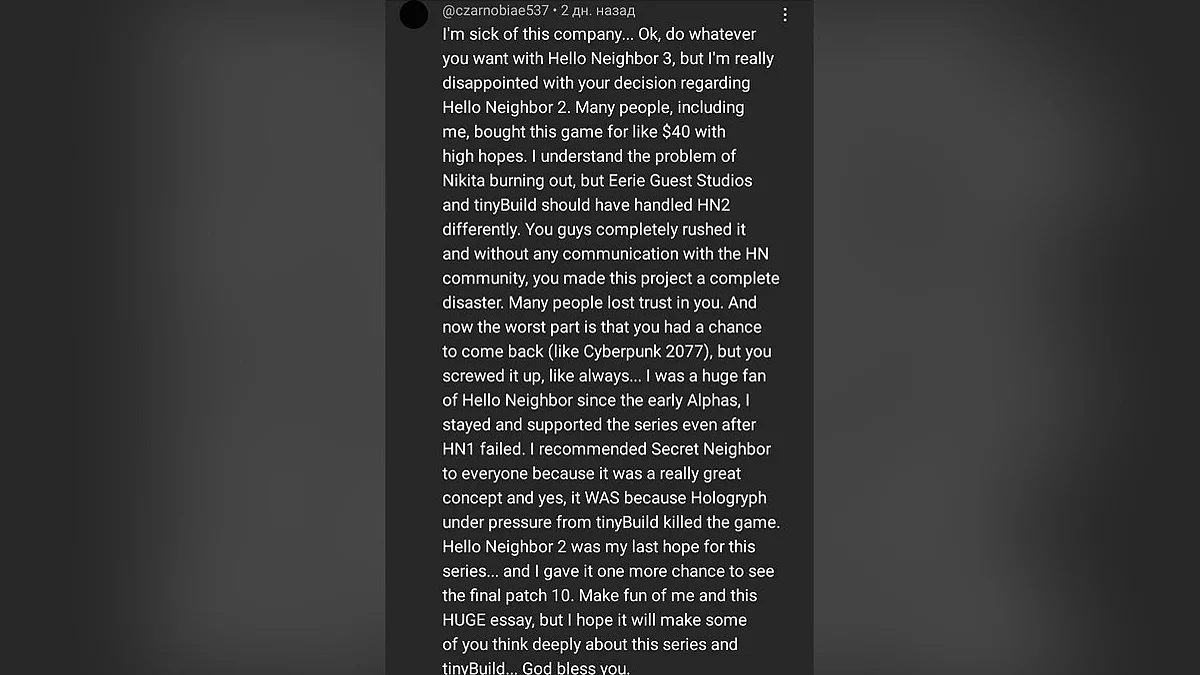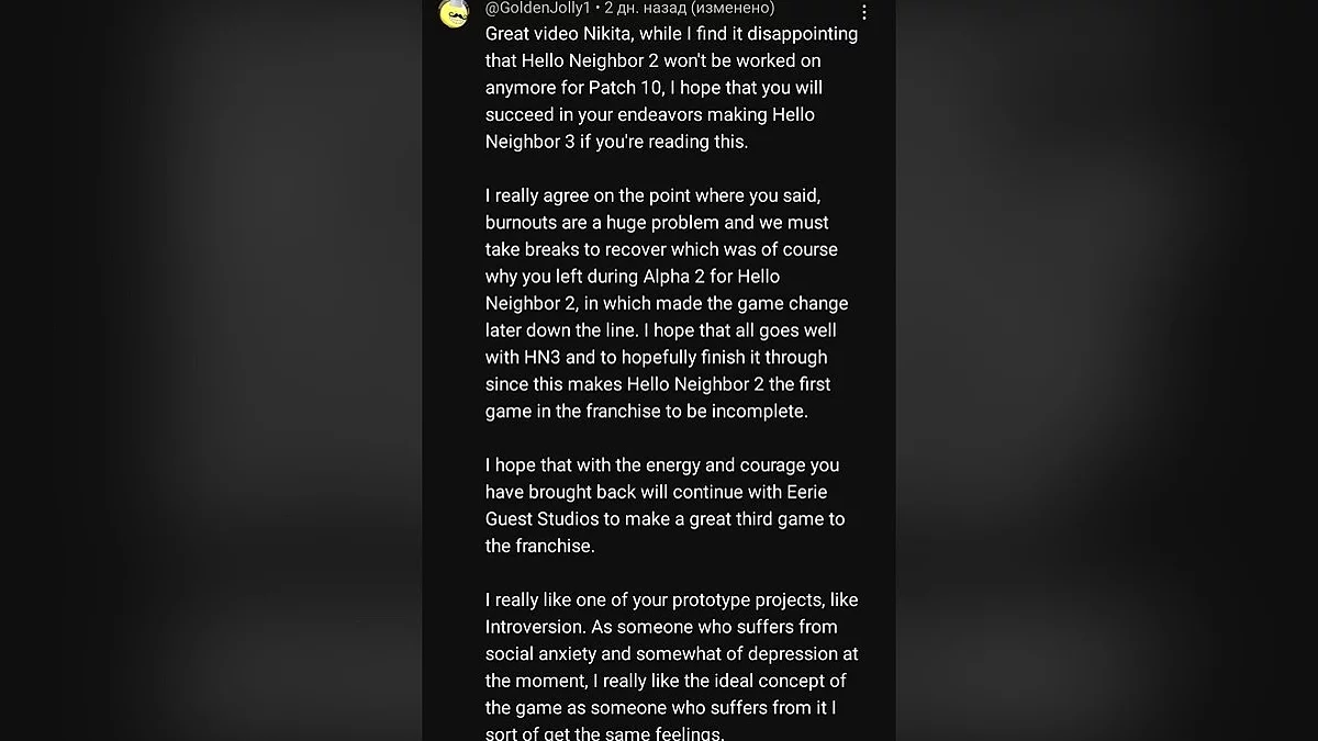 - Микита покинув розробку Hello Neighbor 2 під час альфа-версій, оскільки він відчував себе виснаженим.