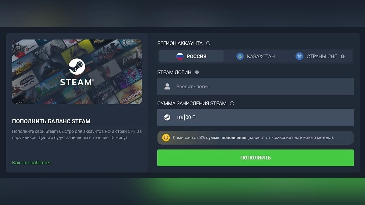 Поповнення гаманця Steam від 100 рублів з мінімальною комісією -