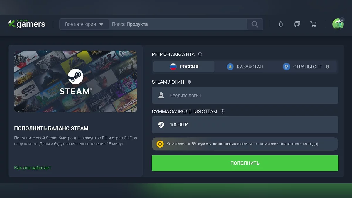 Поповнення балансу актуально для наступних регіонів: РФ, Казахстан і СНД. Гроші будуть зараховані протягом 15 хвилин після оформлення замовлення (в рідкісних випадках — до 2 годин). Валюта залежить від регіону акаунта Steam.