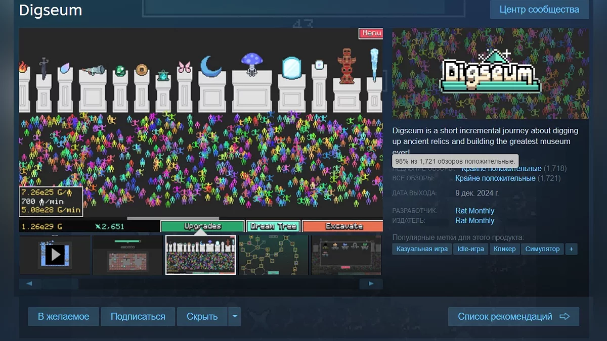 В грудні в Steam вийшла проста з технічної точки зору гра під назвою Digseum, яка на подив стала однією з найвищо оцінених проектів місяця. На момент написання новини її рейтинг складає 98%. Він сформований на основі 1,7 тис. користувацьких відгуків.