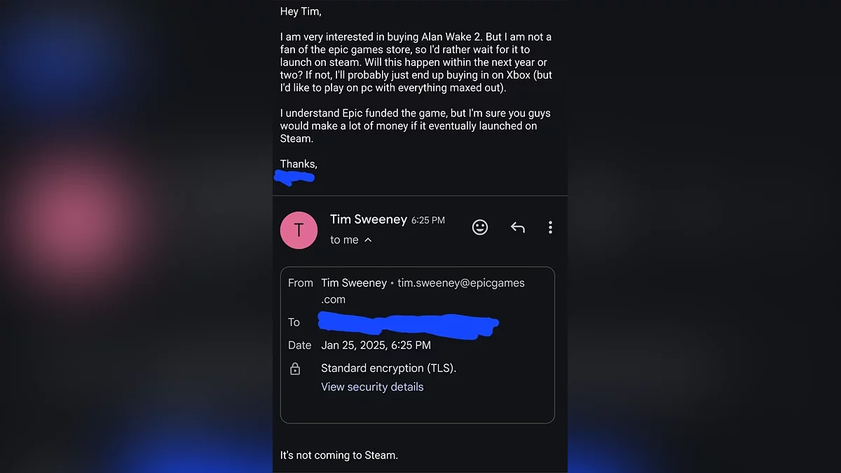 Один з користувачів Reddit поділився скріншотом листа, який надіслав голові Epic Games. У ньому геймер попросив розповісти про терміни випуску Alan Wake 2 в Steam, заявивши, що є великим шанувальником гри, але саму платформу вважає незручною і чекає виходу проєкту на конкурентній платформі. До його здивування, Тім Суіні все-таки відповів, заявивши, що «гра не вийде в Steam».