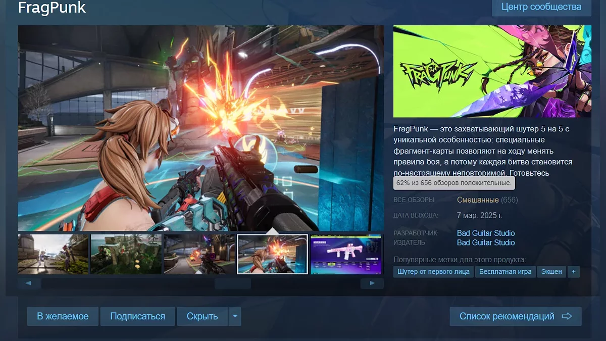 На PC відбувся реліз багатокористувацького шутера від першої особи під назвою FragPunk. Перші відгуки в Steam — змішані. Рейтинг на момент написання новини становить 62%.