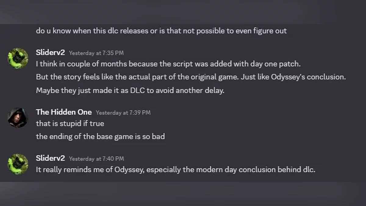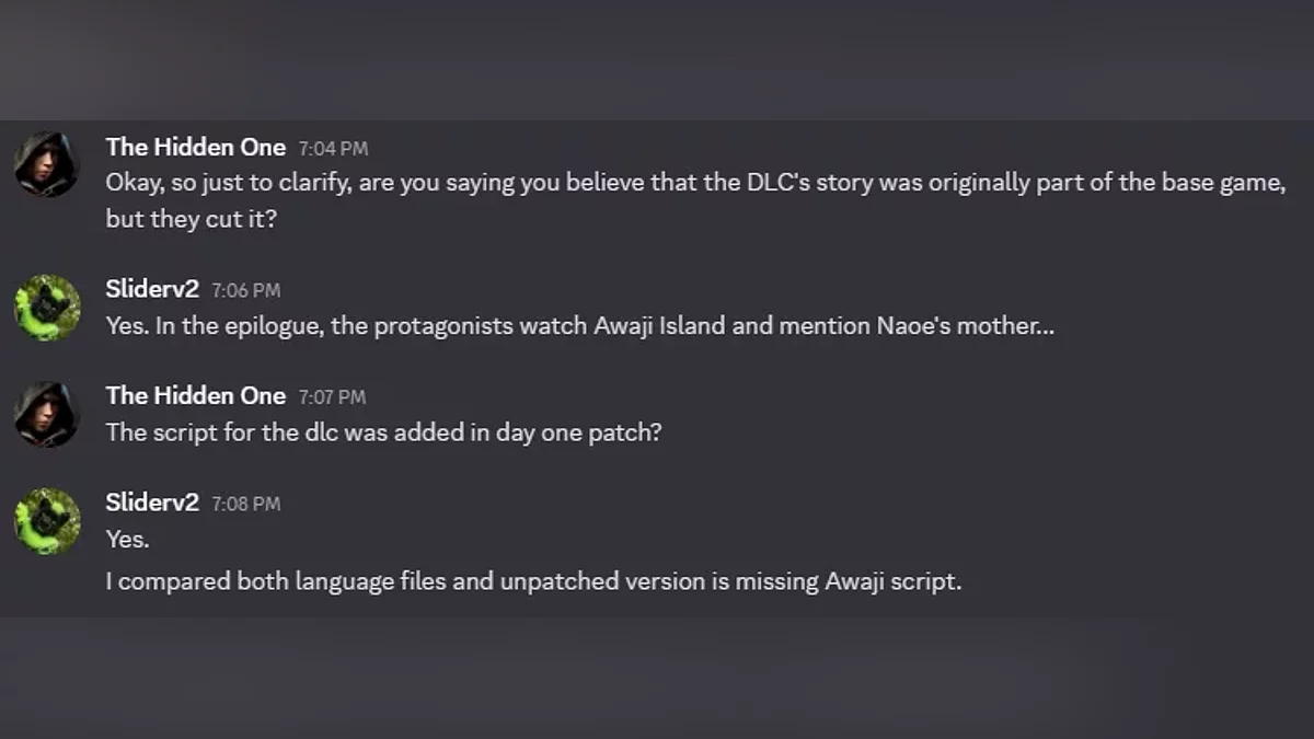 Його слова передав блогер TheHiddenOneAC, поділившись скріншотами переписки. Датамайнер SliderV2 вважає, що сюжетне доповнення Claws of Awaji («Кігті Аваджі») спочатку було частиною основної гри. Готовий сценарій він виявив у патчі першого дня і навіть встиг прочитати, заявивши, що історія DLC відчувається як те, що спочатку було в грі — без доповнення сюжет виглядає незавершеним.