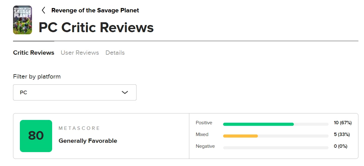 Пригодницький екшен Revenge of the Savage Planet отримав в основному високі оцінки від преси. На момент написання новини проект має 80 балів на Metacritic. Користувацька оцінка буде сформована пізніше.