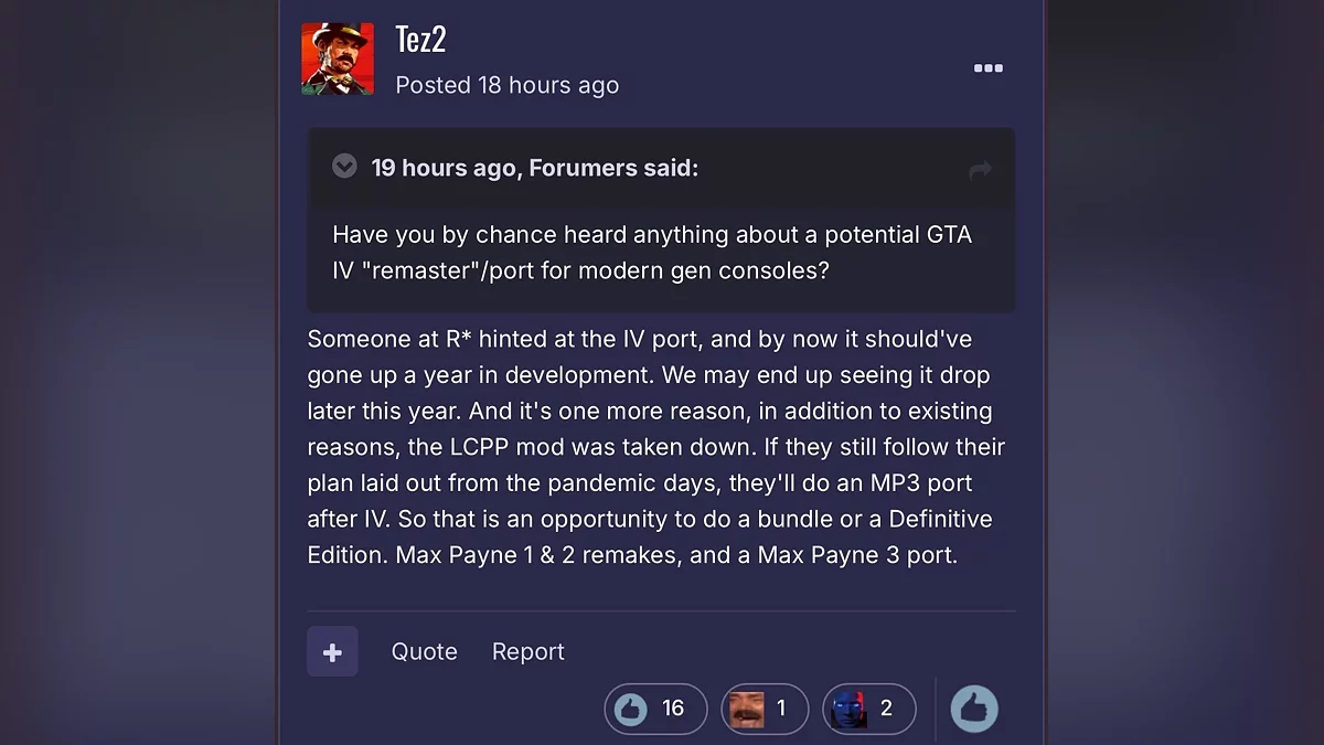 Згідно з даними авторитетного інсайдера Tez2, студія Rockstar Games працює над перевиданнями Grand Theft Auto 4 та Max Payne 3 для сучасних платформ. Ремастер першої гри може з'явитися вже цього року.