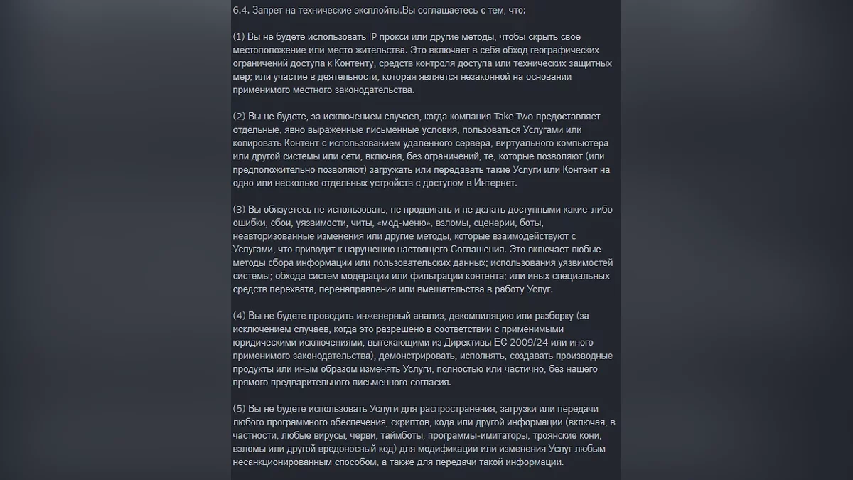 Однак варто зазначити, що нова політика компанії застосовується до всіх її ігор, включаючи багатокористувацькі проекти, тому в загальному угоді і фігурує античит. Крім того, EULA передбачає, наприклад, покупки ігор у самої Take-Two, чому в списку згадується інформація про оплату та інші дані, що надаються гравцями самостійно.