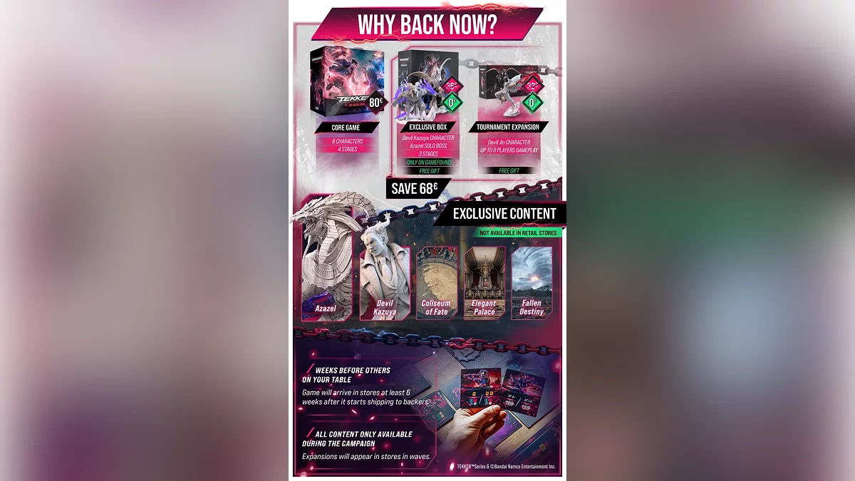 Настільна гра Tekken: The Board Game, заснована на популярній серії файтингов, зібрала потрібну суму на краудфандинговій платформі Gamefound всього за 35 хвилин і 45 секунд. При початковій меті в 50 тис євро, гра вже залучила понад 350 тис євро, перевищивши початкову мету в сім разів.