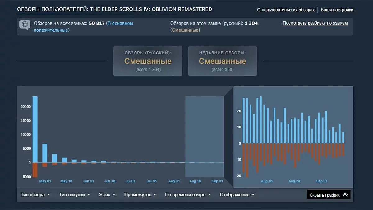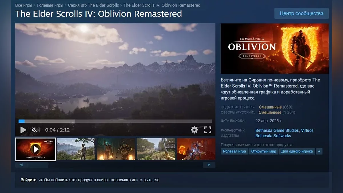 Постепенно спільнота гравців змінює ставлення до The Elder Scrolls 4: Oblivion Remastered. Минуло кілька місяців після захоплених відгуків, рейтинг ремастера в Steam почав падати через баги, погану оптимізацію та інші проблеми.