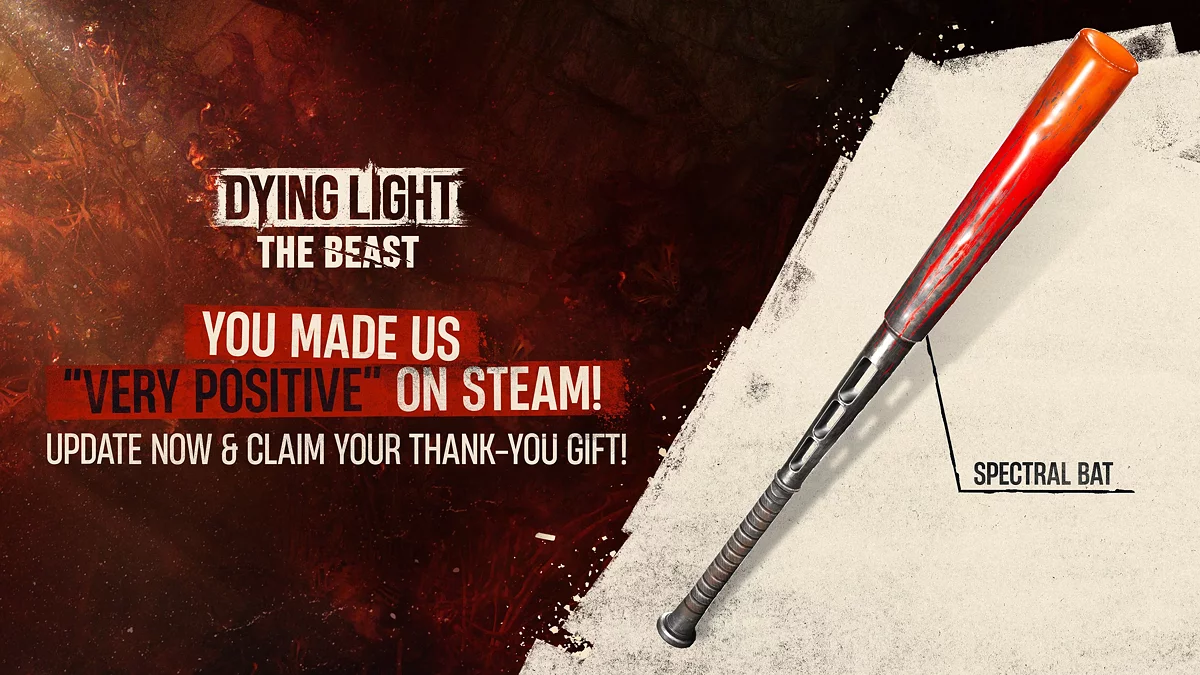Ви неймовірні! Завдяки більш ніж 8 000 відгукам у Steam та вражаючим 90% рекомендацій Dying Light: The Beast отримала статус відгуків «Дуже позитивні». В знак нашої подяки ми даруємо кожному гравцеві особливий подарунок — Spectral Bat.