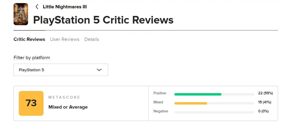 До релізу Little Nightmares 3 залишилися лічені дні. Зовсім нещодавно на Metacritic з'явилися перші оцінки гри від преси. Зараз проект має в середньому 73 бали. Для порівняння, у першої частини 78 балів, а у другої — 82 бали.