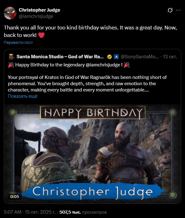 Нещодавно студія Santa Monica відсвяткувала 61-річчя виконавця ролі Бога війни, розмістивши привітальний пост на честь актора. Відповідь не забарилася — Джадж репостнув запис до себе і опублікував подяку команді: «Дякую всім за ваші теплі привітання з днем народження. День був чудовим. А тепер за роботу!»