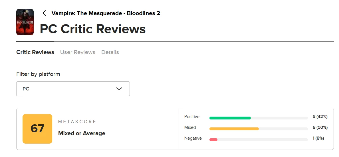 В мережі почали з'являтися перші оцінки рольового екшену Vampire: The Masquerade — Bloodlines 2. На момент написання рейтинг на Metacritic складає 67 балів, але він може змінитися, коли з'явиться більше рецензій.