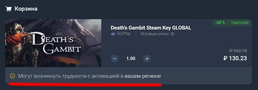 У зв'язку з санкціями багато видавців видалили свої ігри з російського Steam. У такому випадку з активацією ключа в цьому регіоні можуть виникнути проблеми. Відповідний напис буде в описі товару: