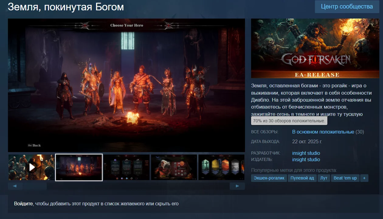 Студія Insight випустила в ранньому доступі Steam гру під назвою God Forsaken, яка виконана в стилі серії Diablo. Перші відгуки від гравців — в основному позитивні. Крім того, доступна демоверсія для ознайомлення.