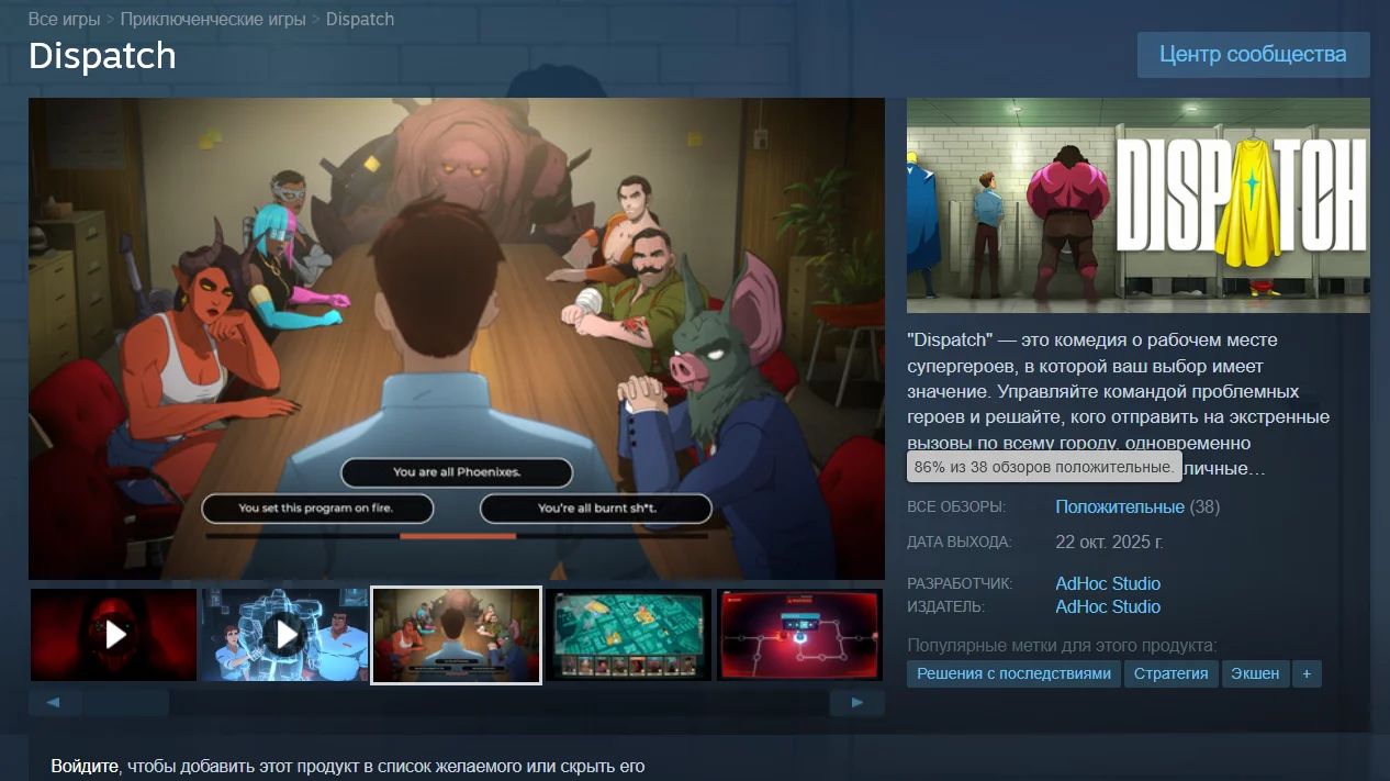 В Steam та на PlayStation 5 відбувся реліз інтерактивної комедійної гри Dispatch, розробником якої виступає AdHoc Studio, заснована в 2018 році колишніми співробітниками Telltale. На момент написання новини рейтинг становить 86%.