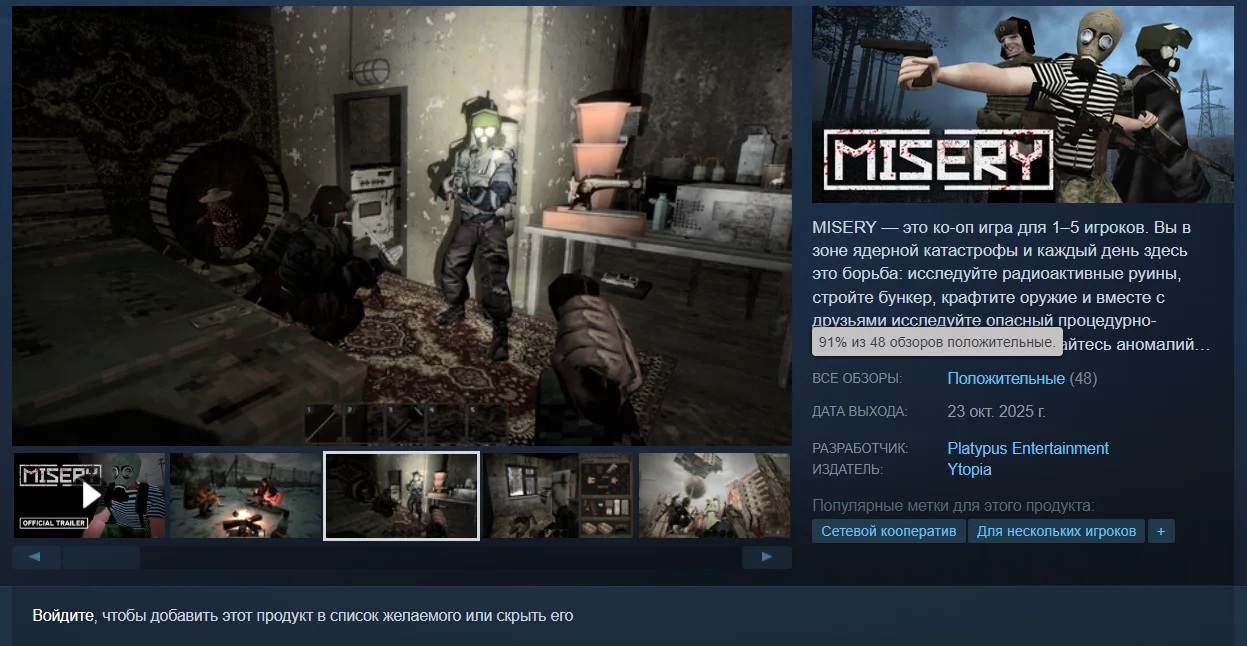 MISERY описується як екшен з елементами виживання та спрощеного рогалика з кооперативом (до 5 гравців), який підійде любителям атмосферних ігор на кшталт Lethal Company та S.T.A.L.K.E.R..