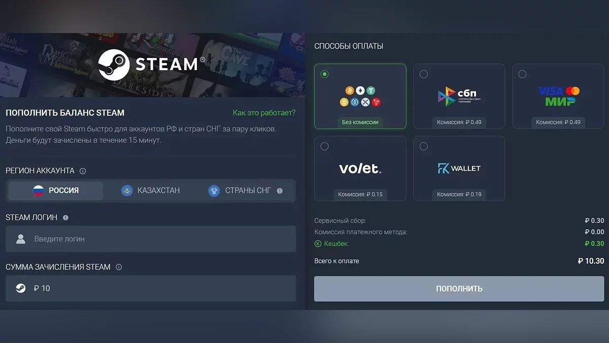 Крім того, геймери також можуть поповнити баланс Steam (з 3% комісією сервісу) на будь-яку суму від 10 руб.