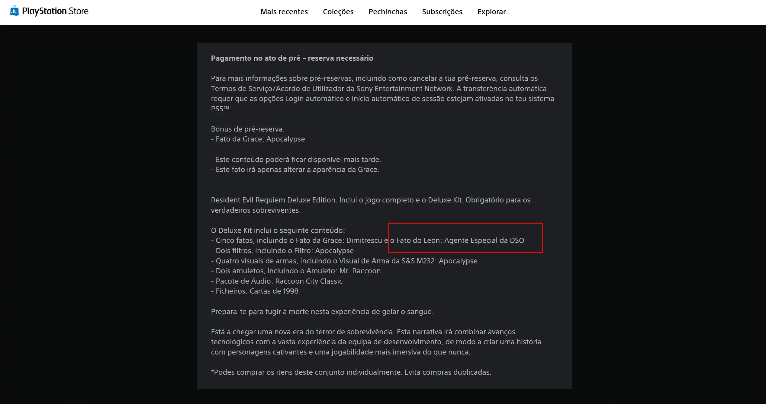 На офіційній сторінці попереднього замовлення Resident Evil Requiem Deluxe Edition для PlayStation 5 на португальському сайті компанії користувачі помітили несподівану деталь: в описі бонусів вказувався ексклюзивний костюм для Леона Кеннеді в преміум-версії гри.